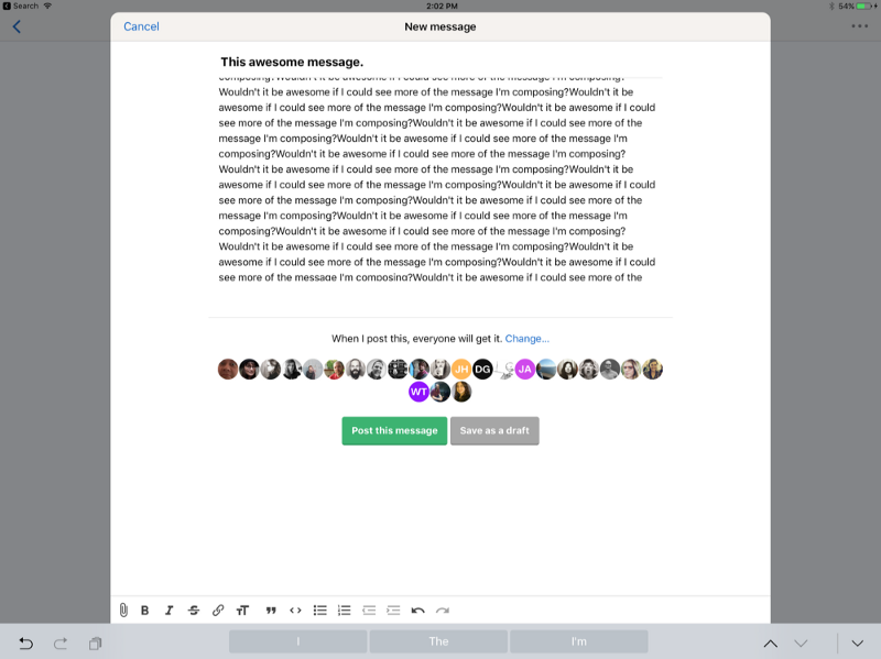 Composing a message when using an external keyboard has a really small viewport that makes it hard to see what you’re writing.