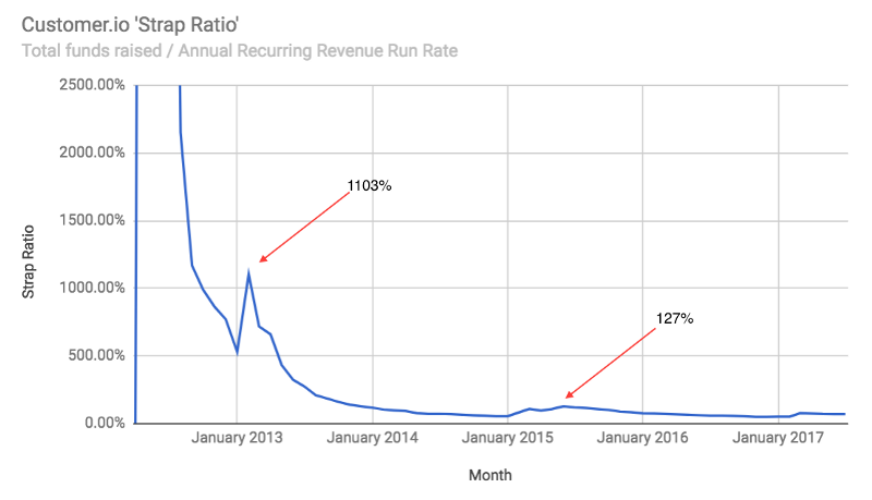 We’ve raised multiple rounds of financing, each time peaking at a much lower strap ratio. In 2013, after a sharply declining strap ratio (and almost running out of funds), we raised more money bringing the total to 1,103% of ARR. Then in 2015 we did it again. This time it was 127% of ARR. Most recently in 2017 we saw an opportunity to invest in the business ahead of revenue again and raised a fraction of our ARR bringing our total funds raised to 76% of ARR.