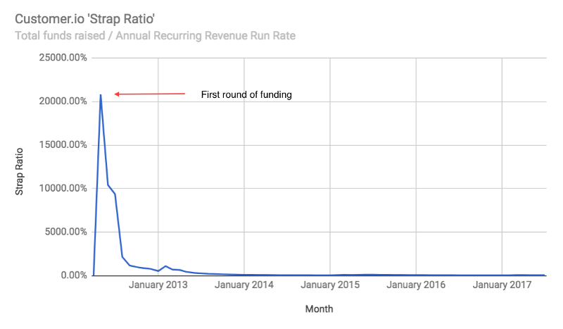 To get Customer.io off the ground in May 2012, we raised $125k in small checks from friends and family plus two angel investors. At the time of that investment, our total capital raised was equivalent to two hundred and eight times (20,833% of) our current annual revenue run rate (ARR).