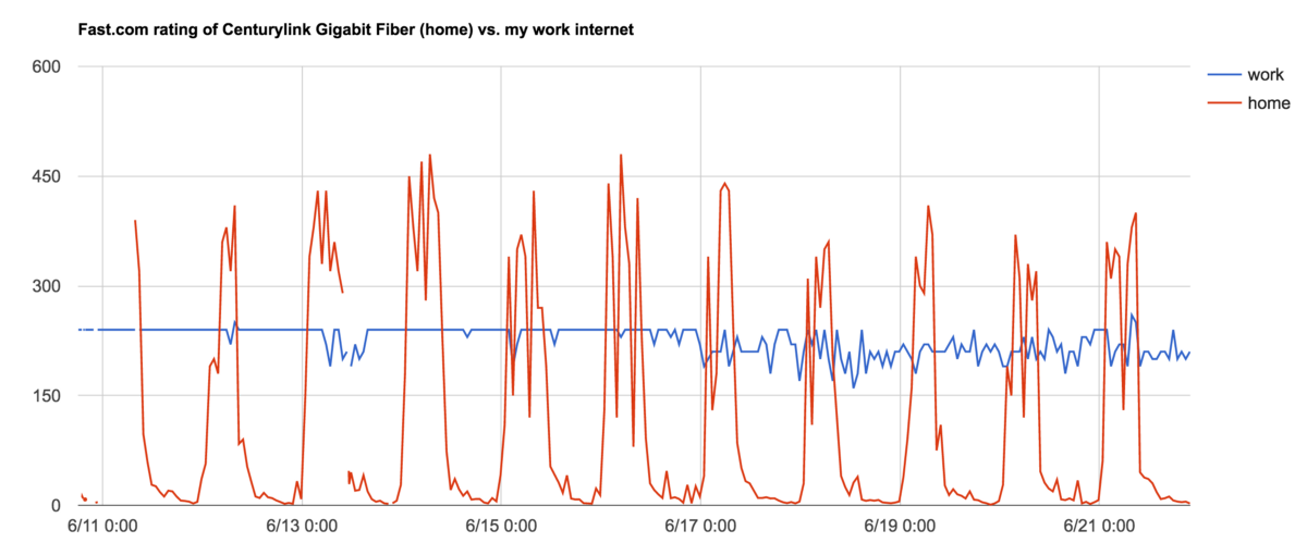 That’s where the “Work” test comes in. That’s my control. My work connection is 250 Mbps so not as fast as home should be. There’s a little bit of variation in the connection speed to Fast.com from Work, but for the most part it’s stable and predictable.
